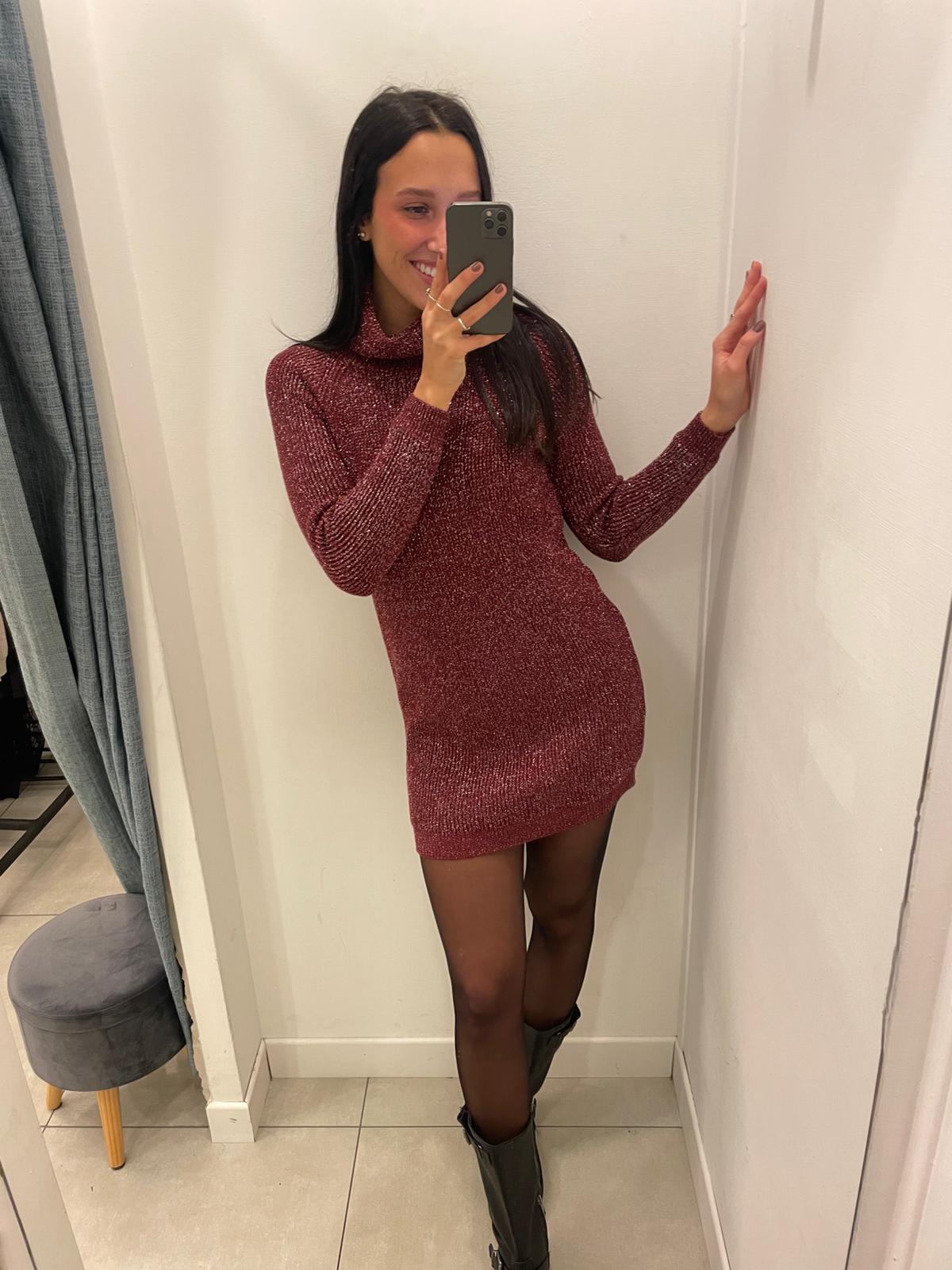 Abitino in maglia molto caldo in filo lurex grosso, vestibilità aderente e collo alto. Taglia unica