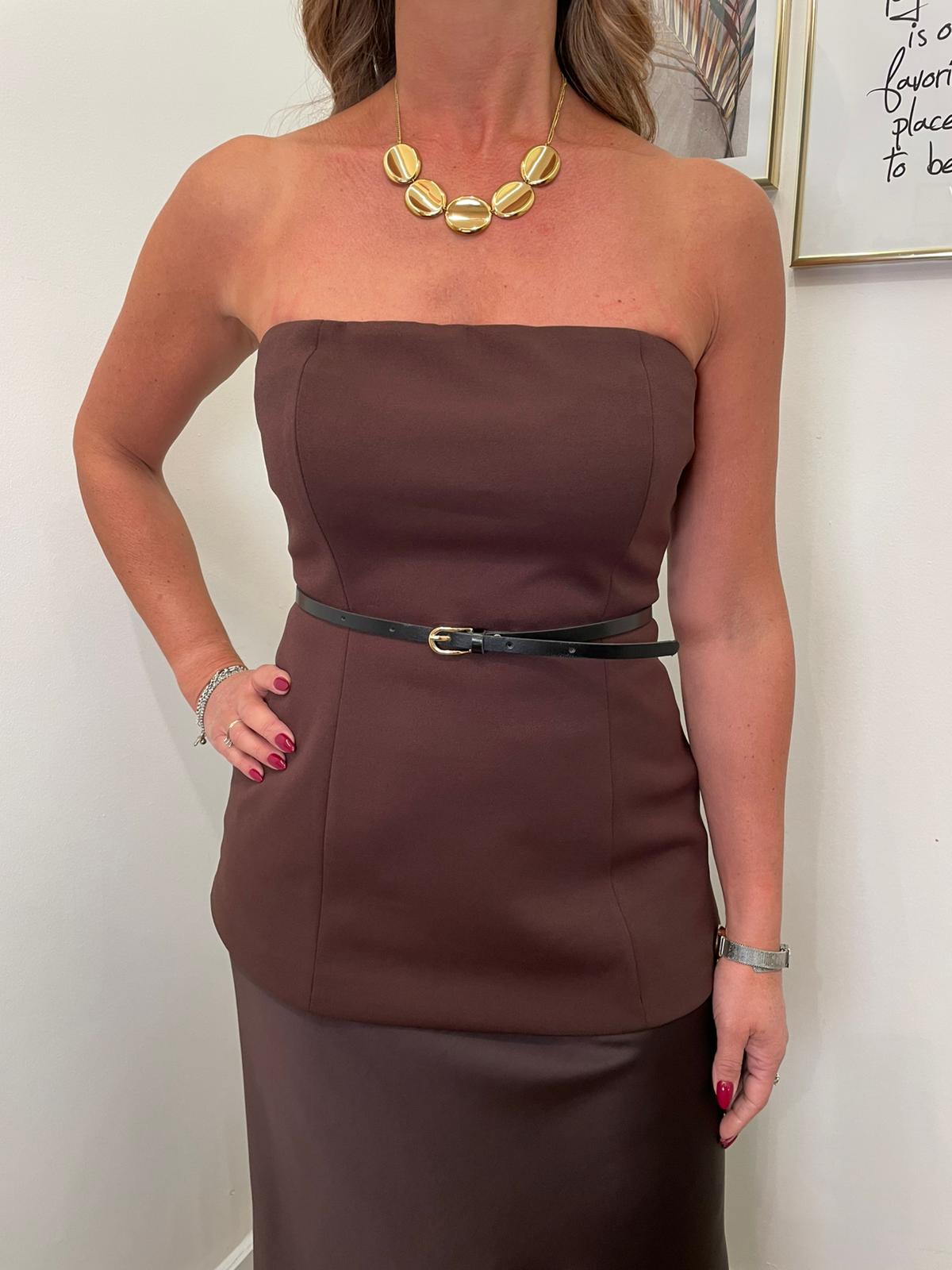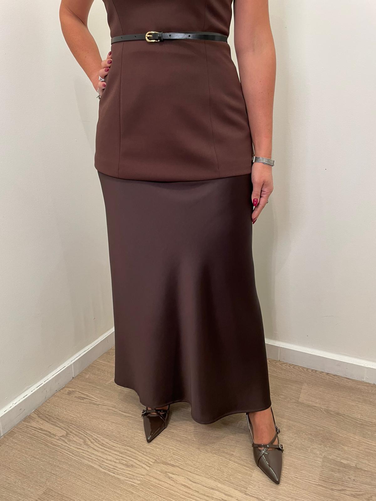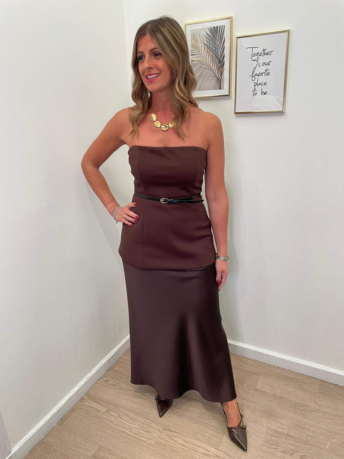 Abito composto da due pezzi, corsetto in tessuto strutturato e gonna in raso cioccolato. Imperial