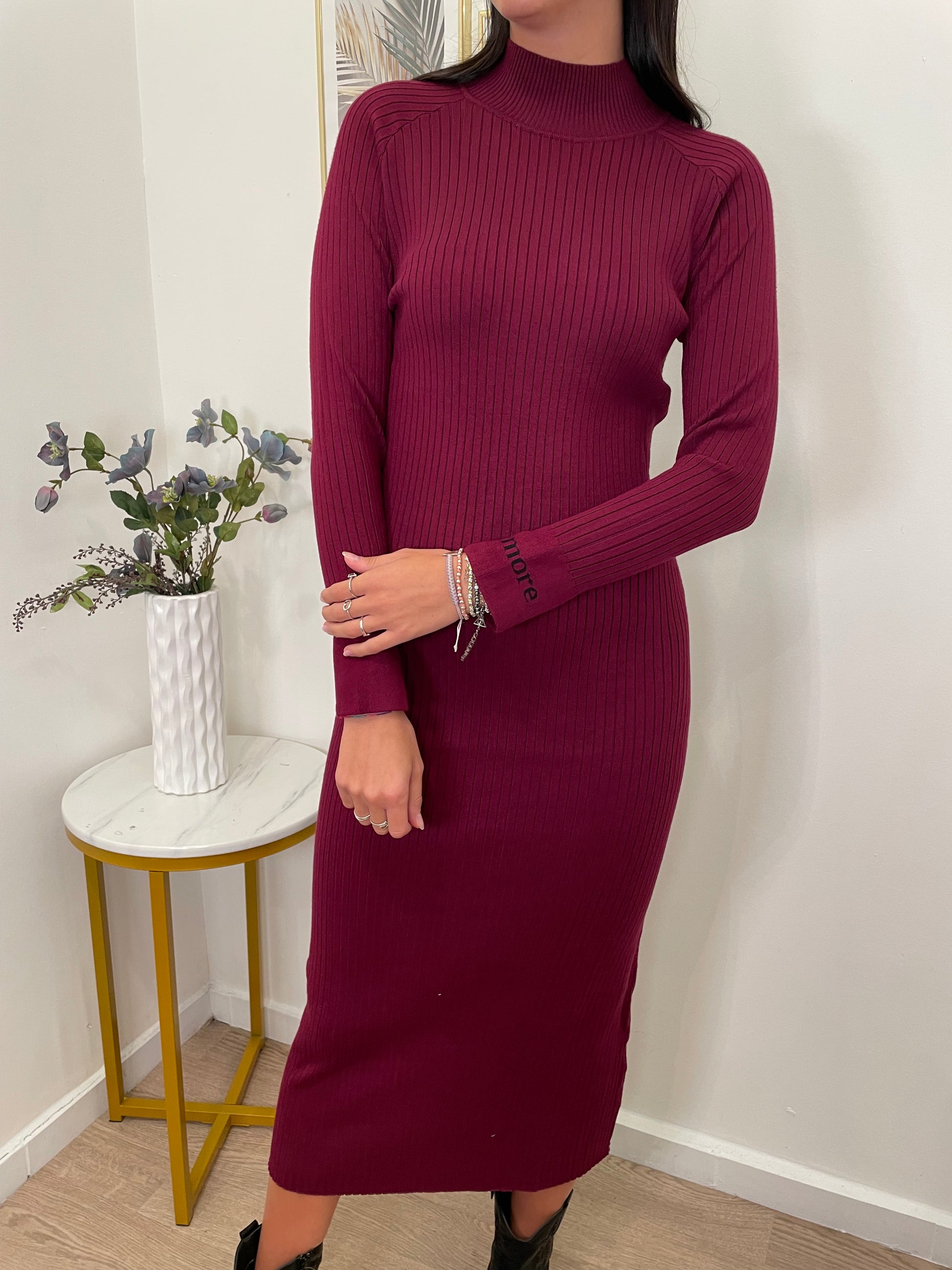 Abito in maglia a coste super morbido ed elasticizzato. Variante Bordeaux con dettaglio scritta in nero.
