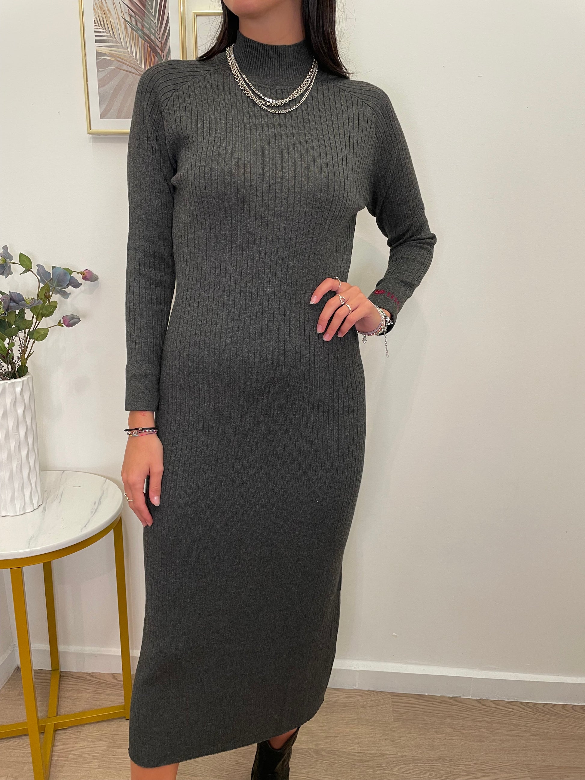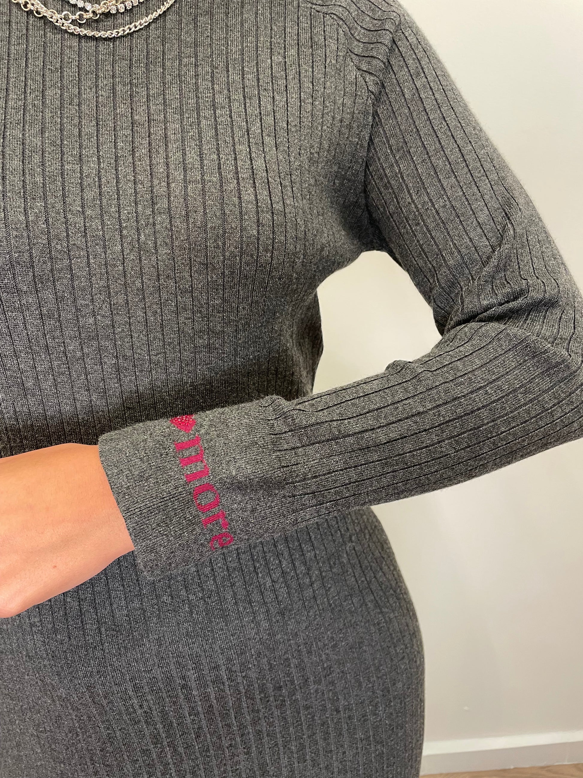 Abito in maglia a coste super morbido ed elasticizzato. Variante grigio mélange con dettaglio scritta sulla manica.