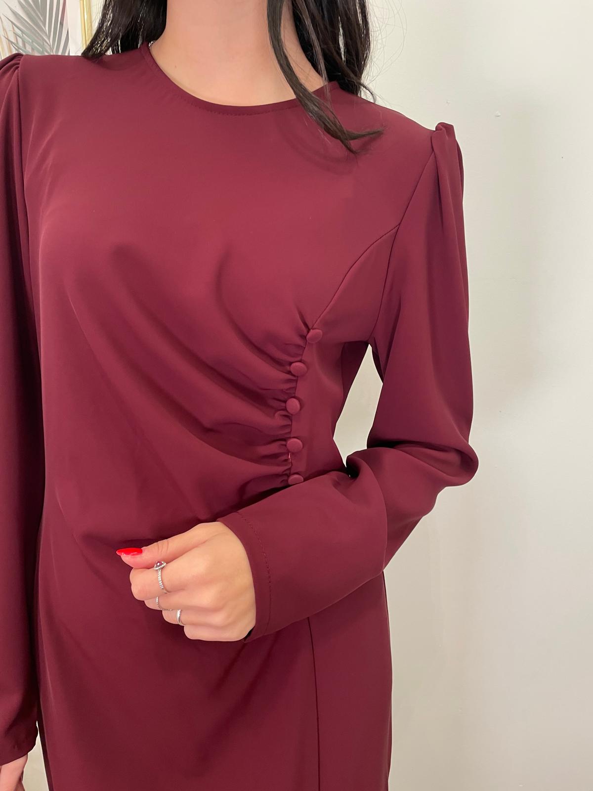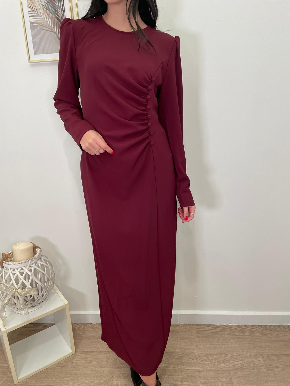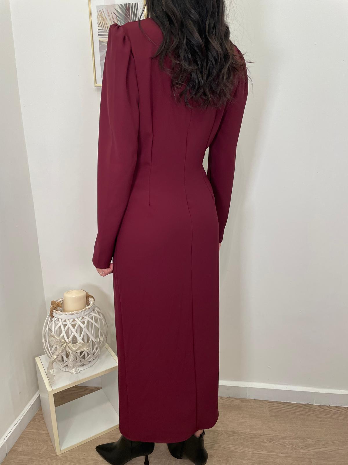 Abito lungo in tonalità bordeaux con elegante drappeggio frontale che crea un effetto sofisticato e lusinghiero. Il taglio fluido valorizza la silhouette, mentre il dettaglio del drappeggio aggiunge movimento e profondità al design. Perfetto per occasioni speciali, cene eleganti o eventi serali.