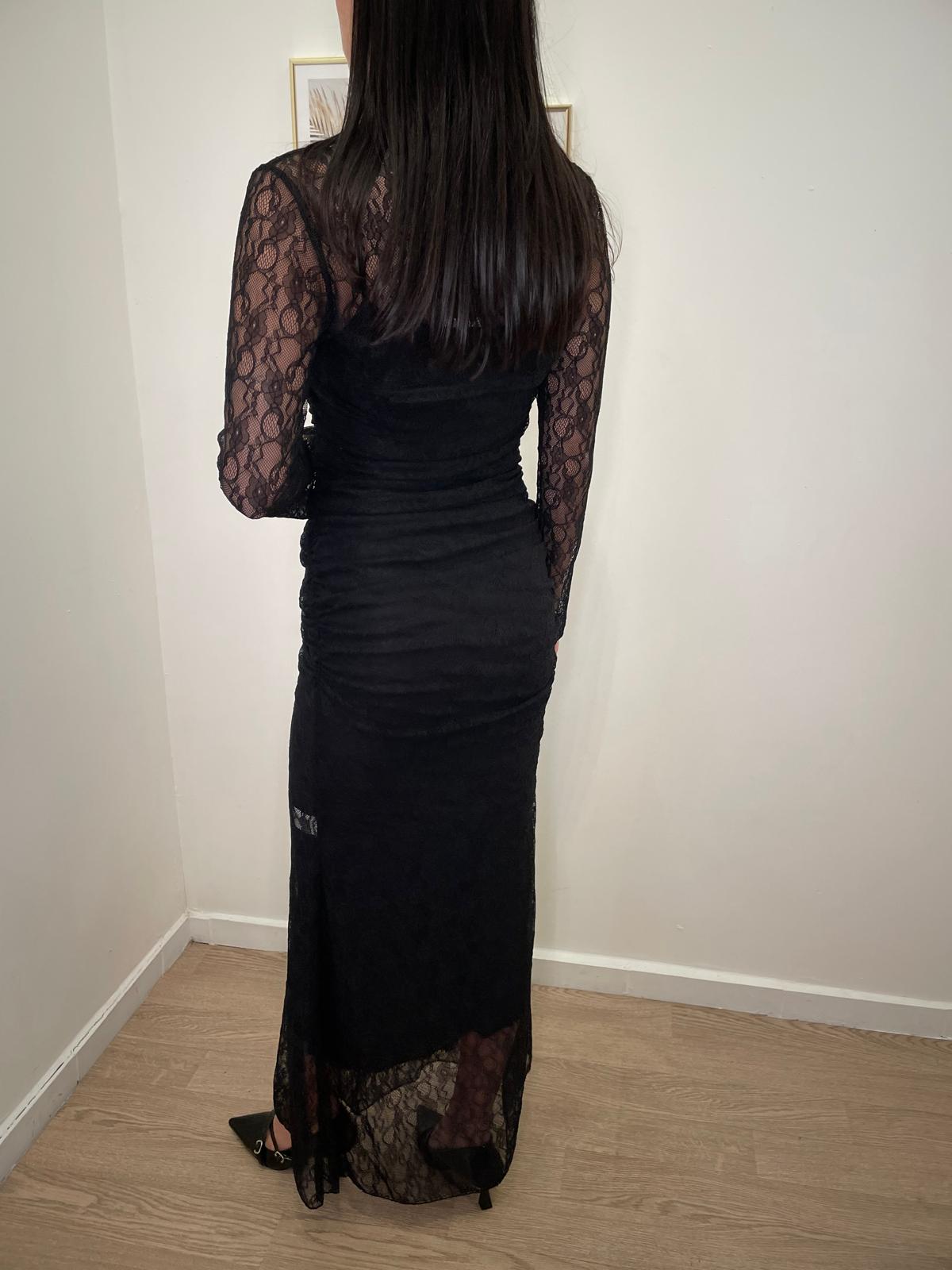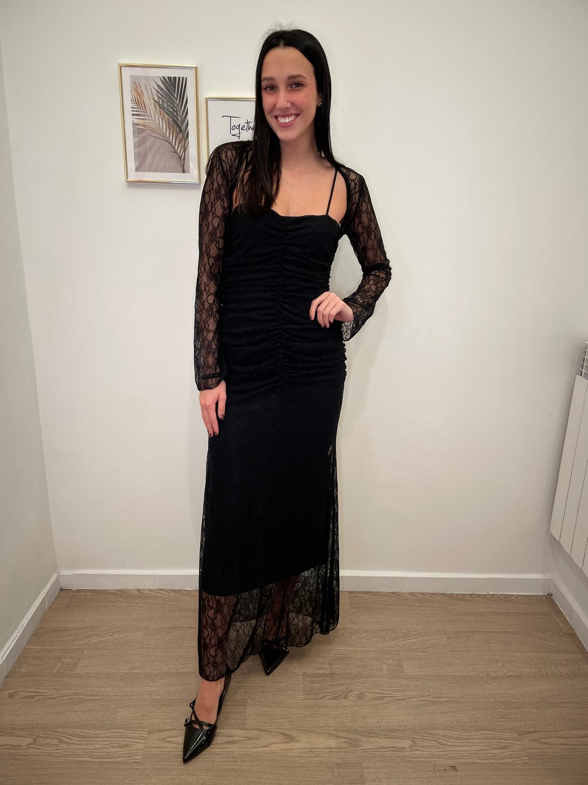 Abito lungo in pizzo drappeggiato nero,spalline sottile,elasticizzato. In abbinato ha il suo coprispalle