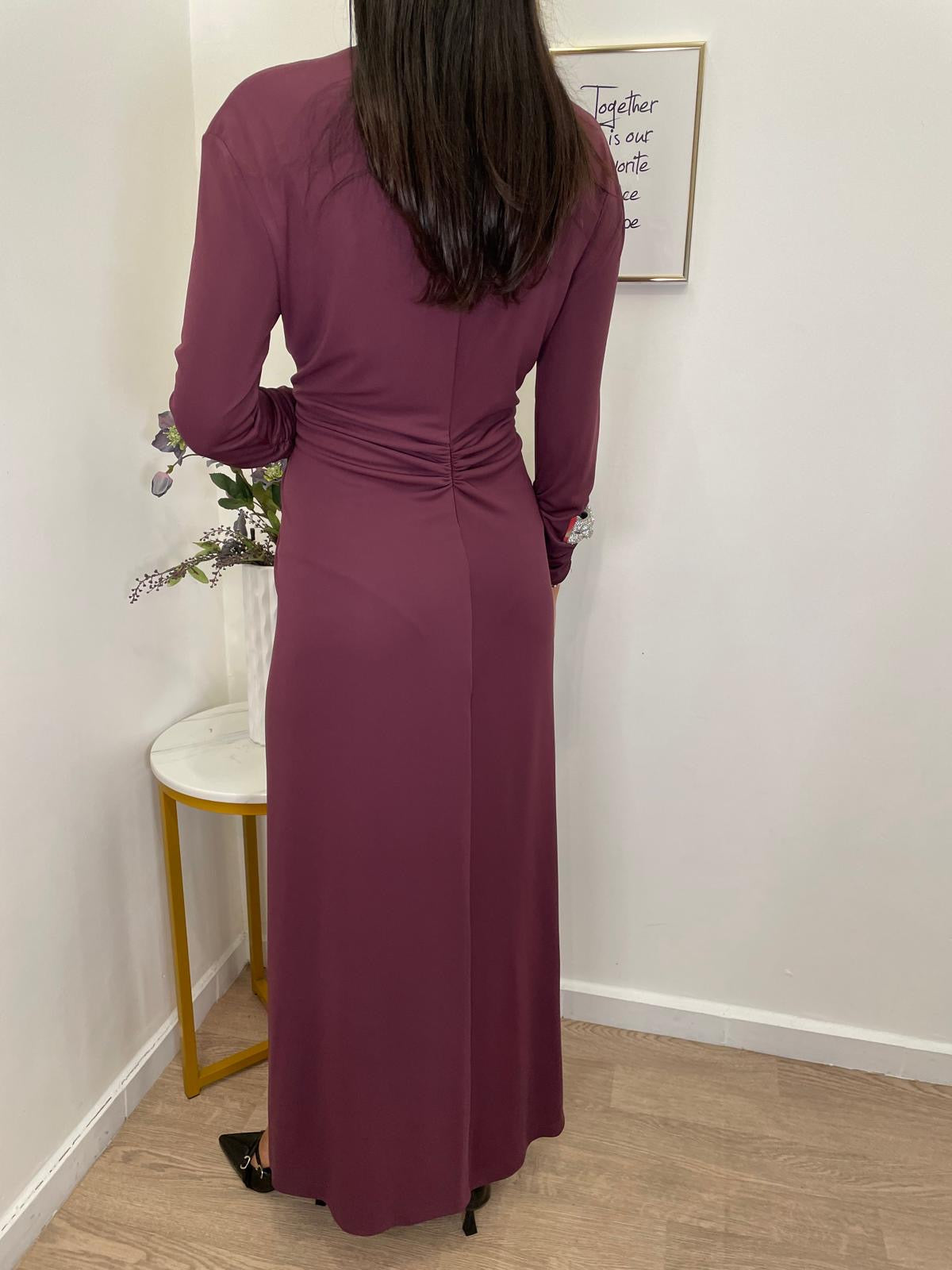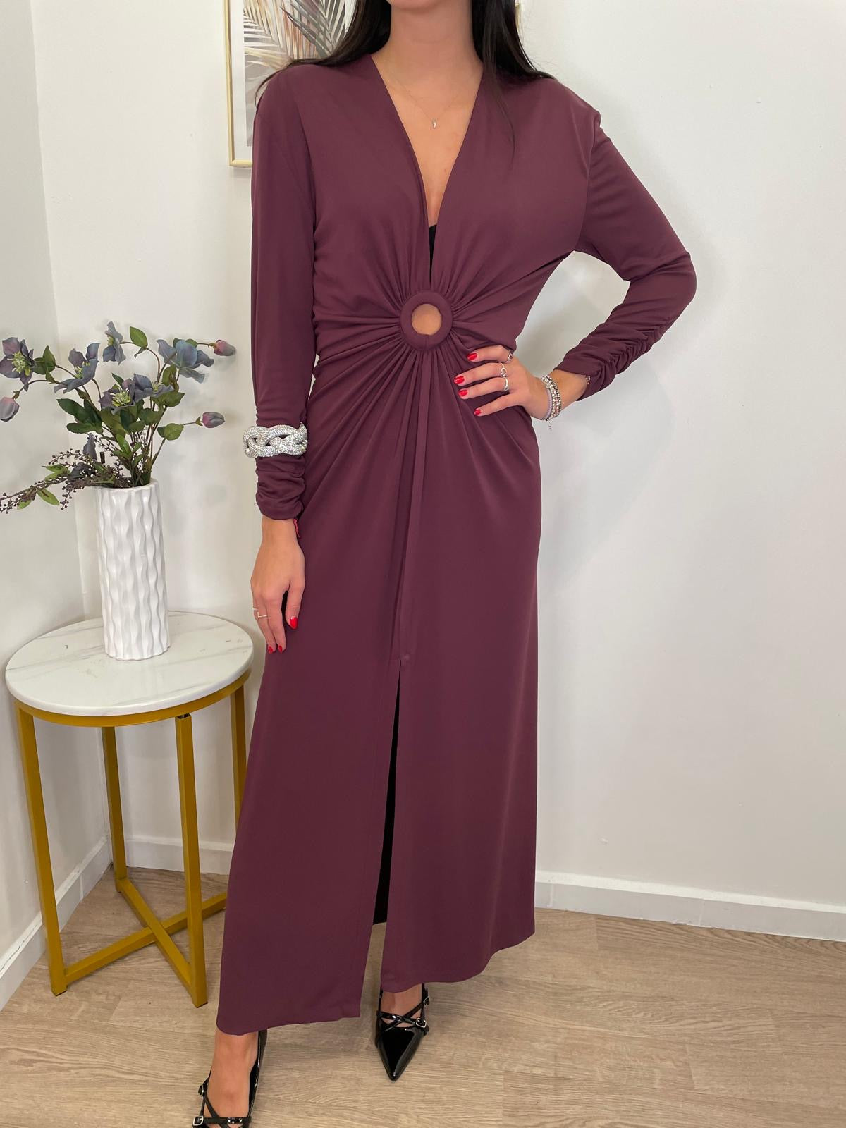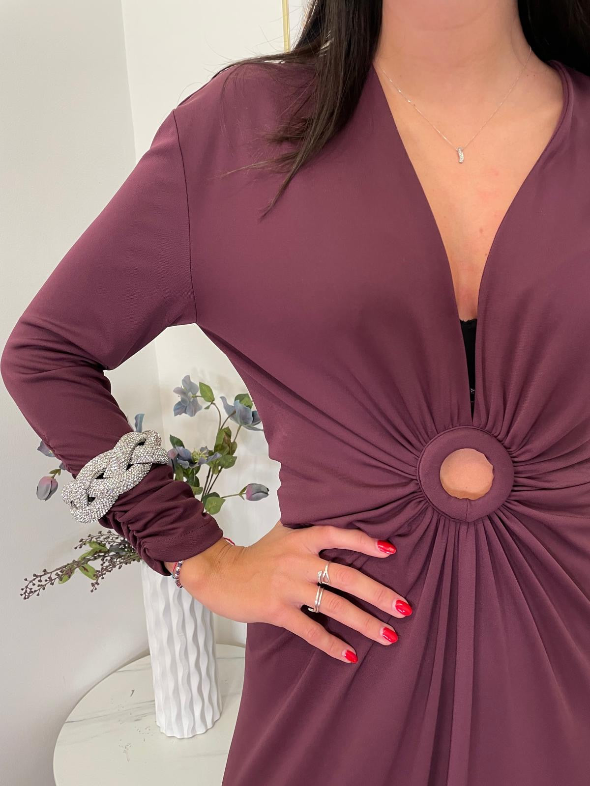 Abito dallo scollo profondo con oblò sul davanti, bellissima sfiancatura arricciata dal color vino. Perfetto per un occasionale speciale!