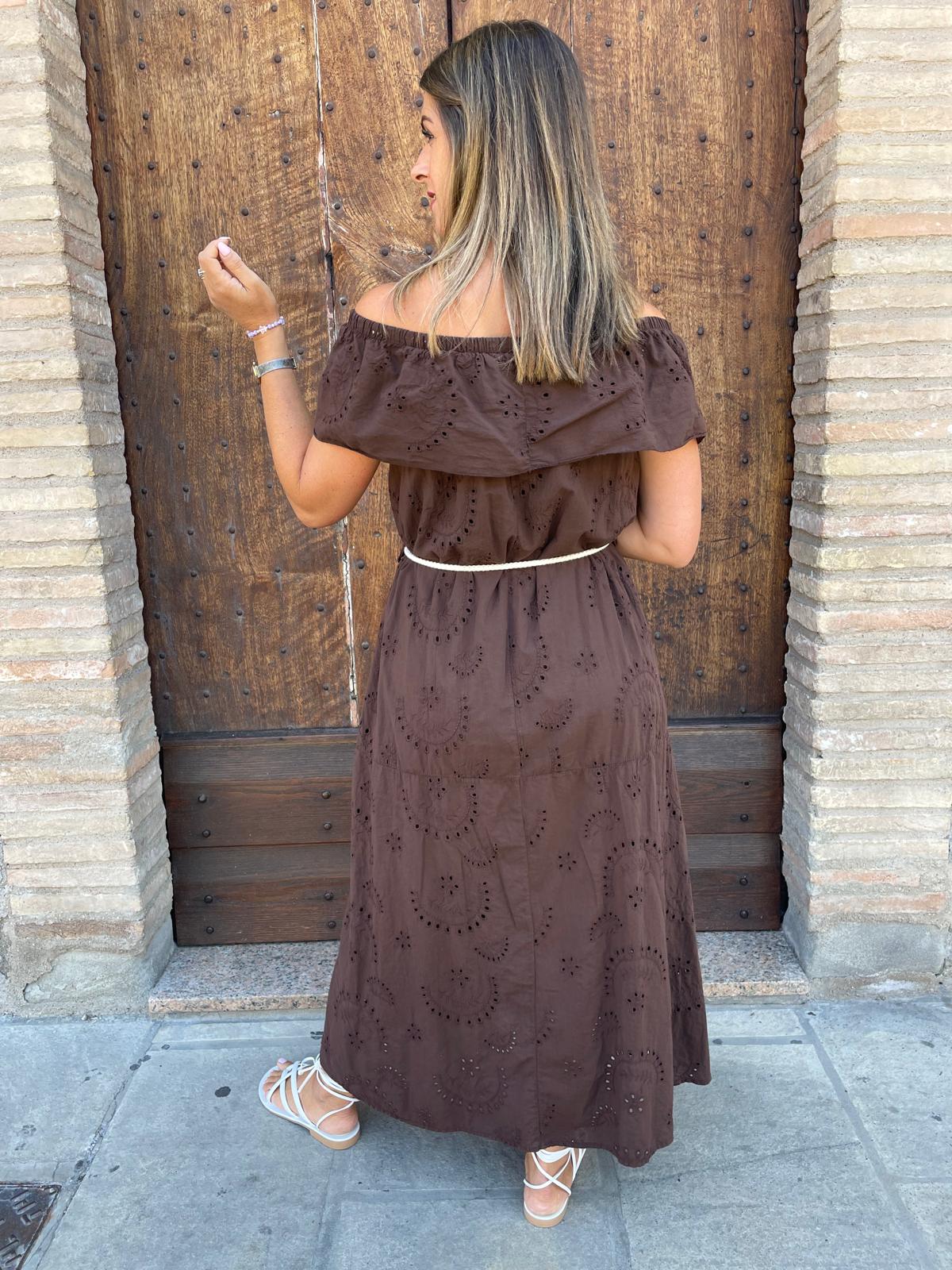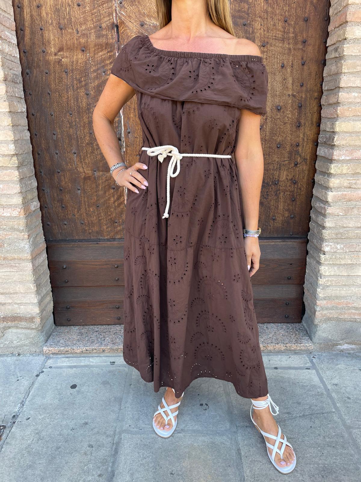 Abito in sangallo con elastico in vita e cinturina in corda, sotto ha la sottoveste. Taglia unica
