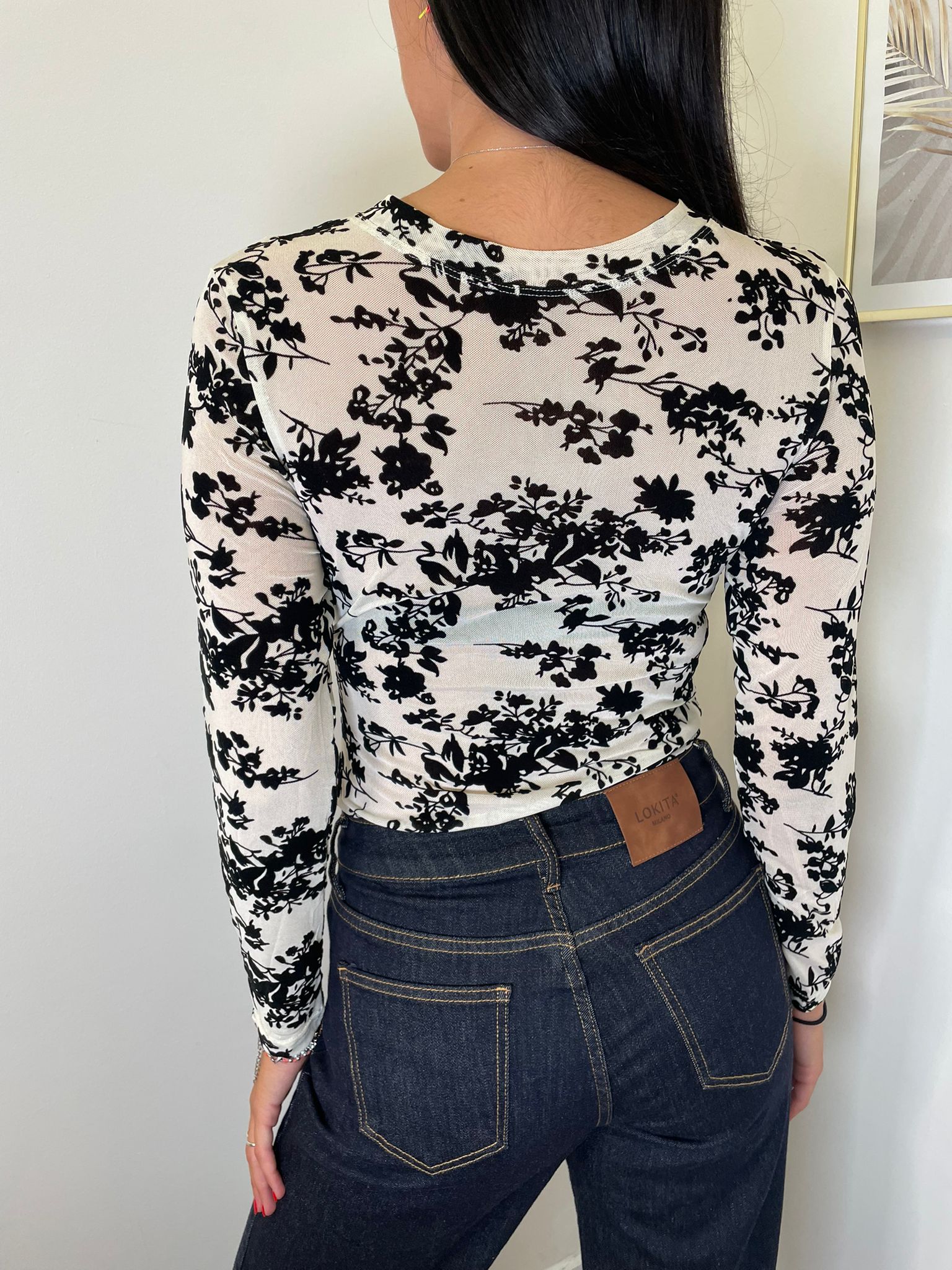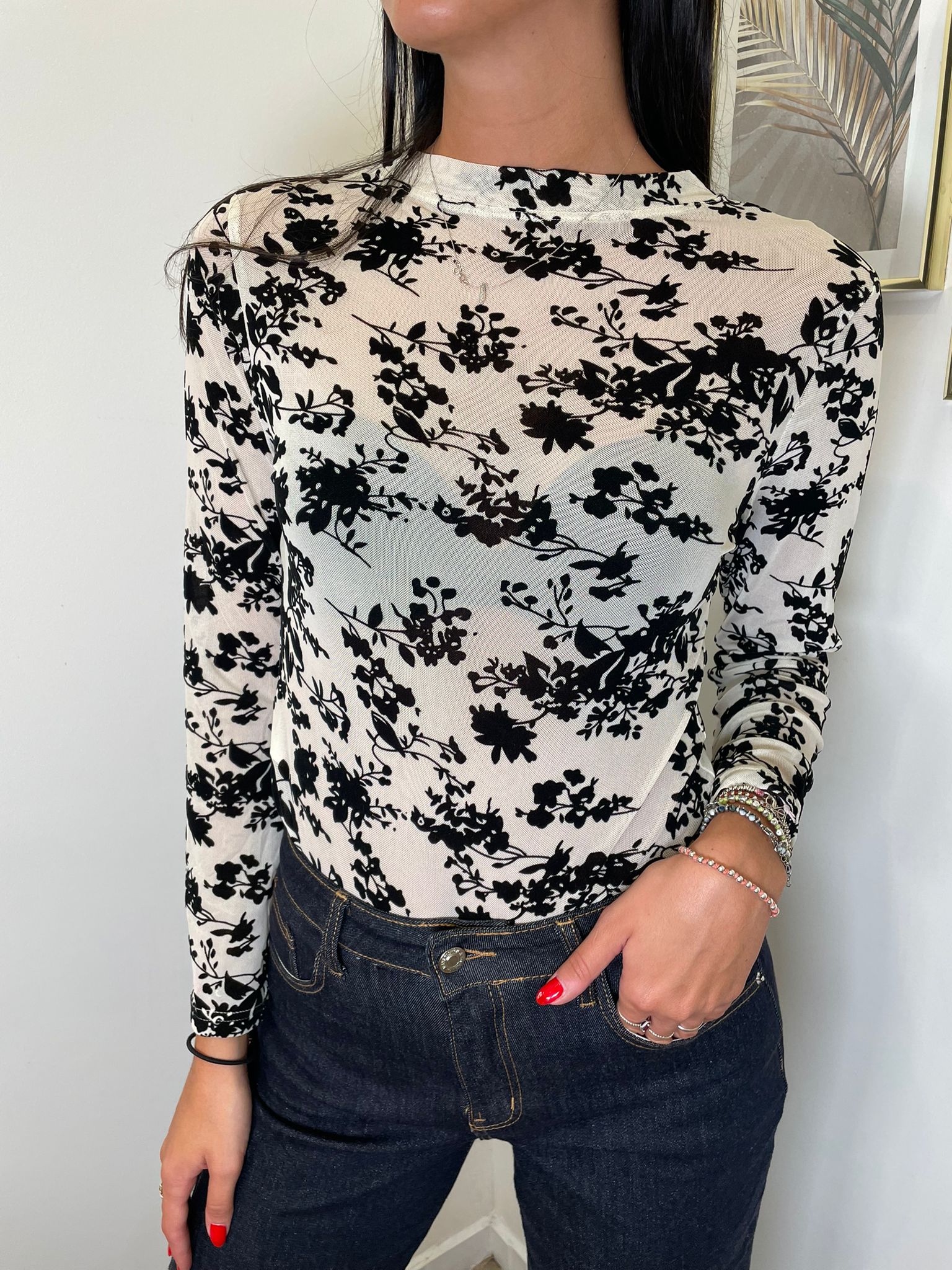 Body in semi trasparenza con fiori in velluto in rilievo. Taglia unica, elasticizzato.