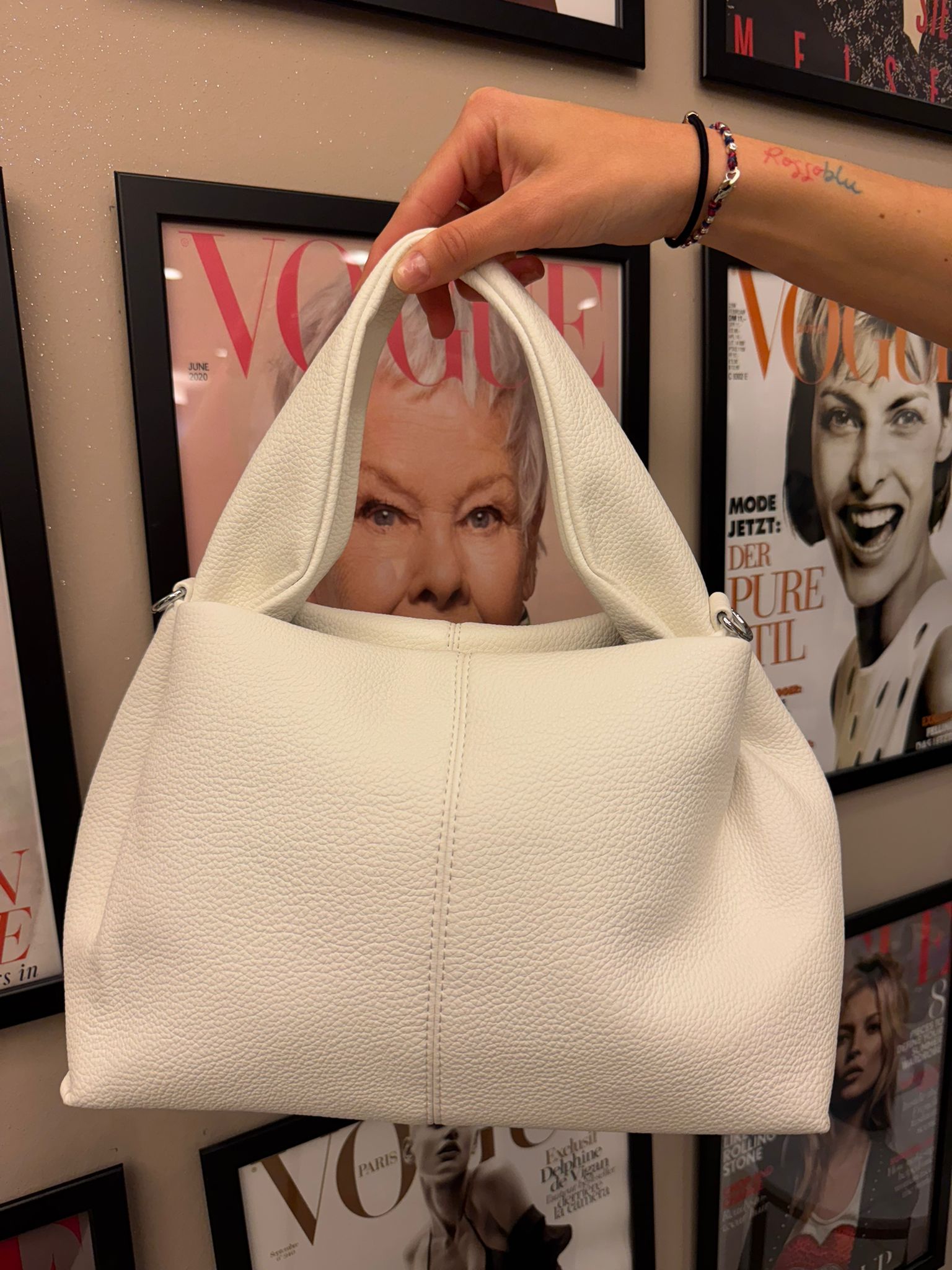 Borsa in modello bombato in morbida eco-pelle bella capiente con manico a mano e tracolla regolabile.