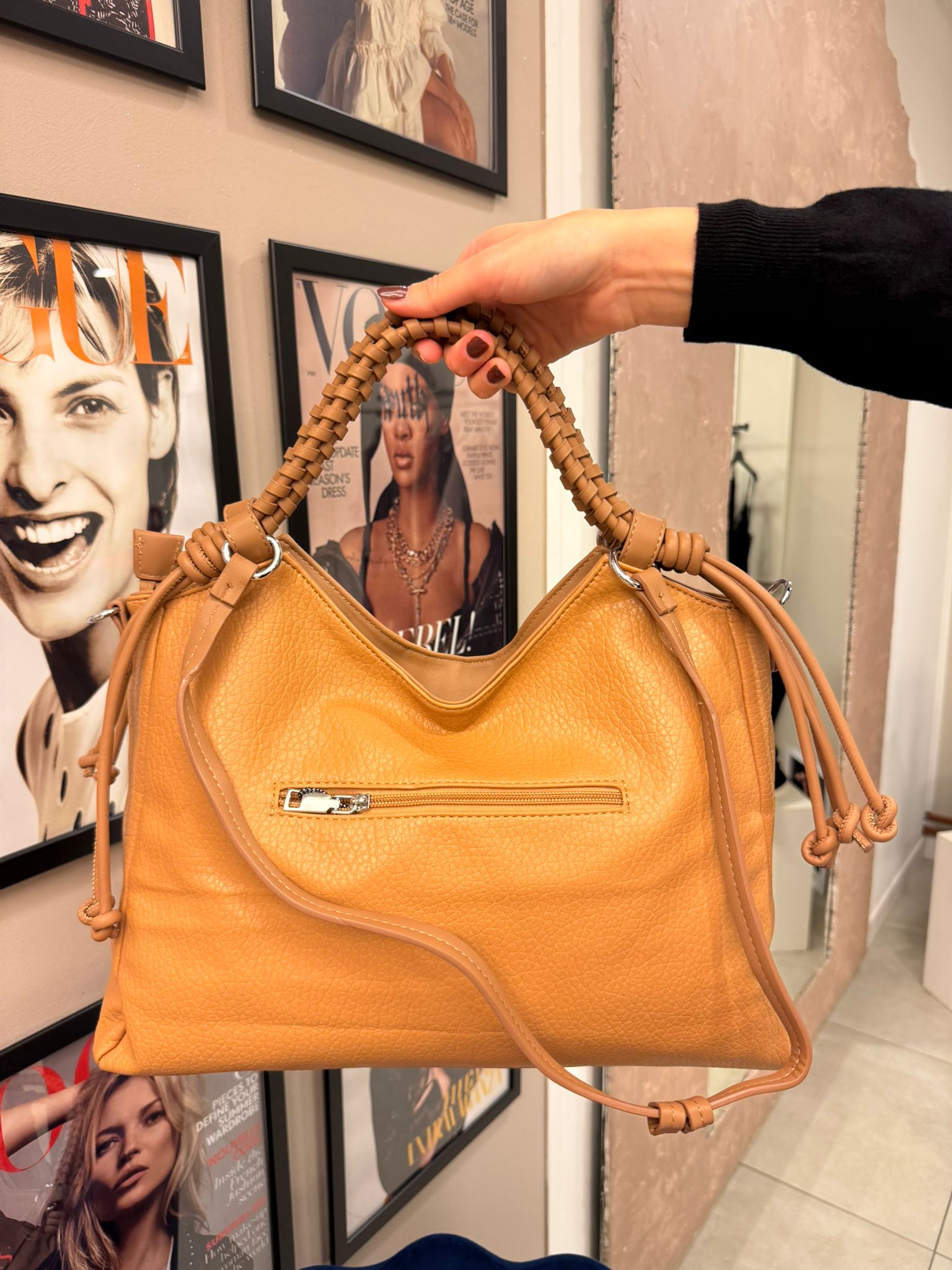 Borsa in eco-pelle extra morbida con manico doppio intrecciato e doppia tracolla lunga, tasche interne ampie.