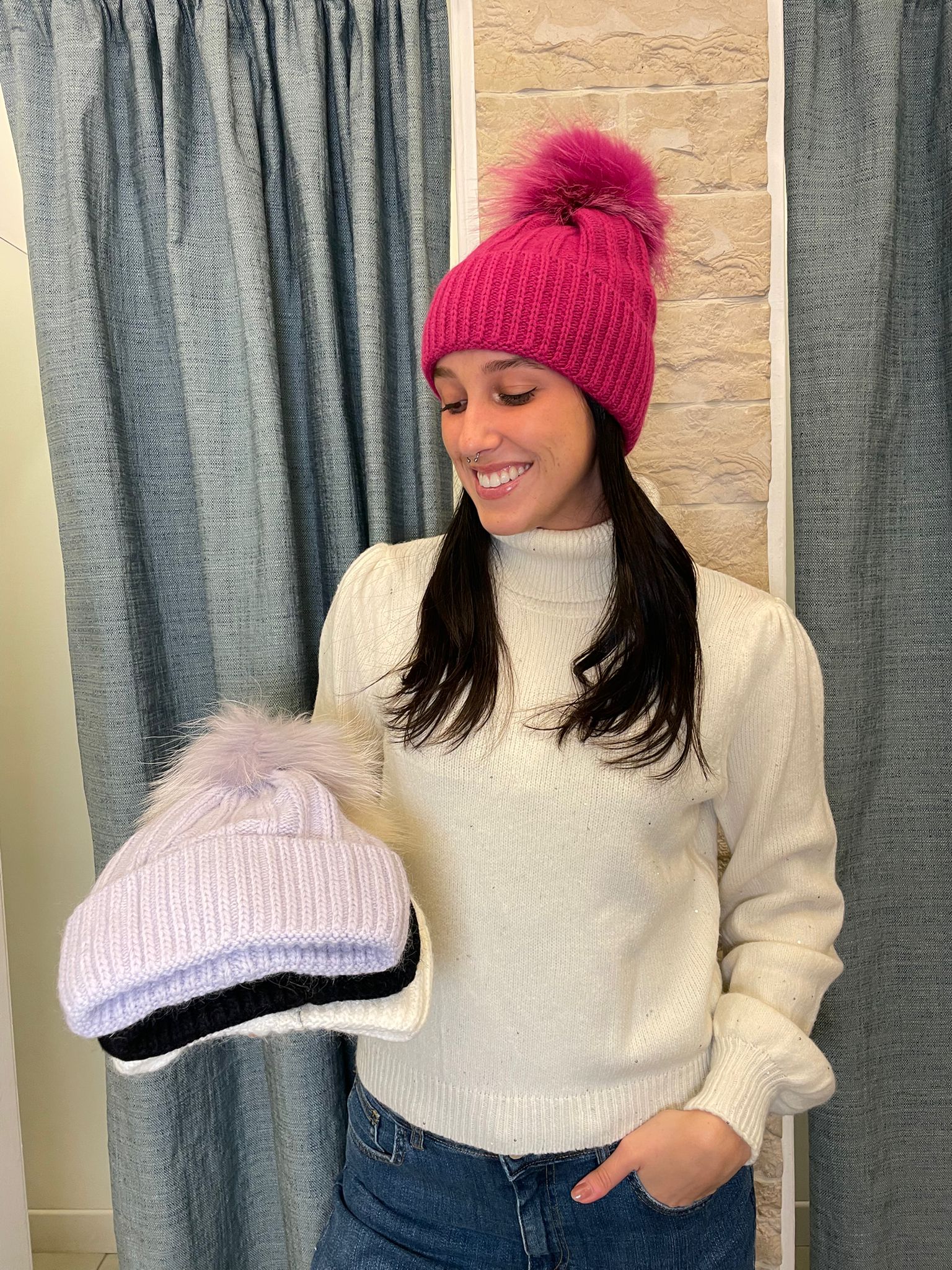 Cappellino con pon pon decorativo in tinta unita. Perfetto per le giornate fredde, offre calore e stile senza compromessi.