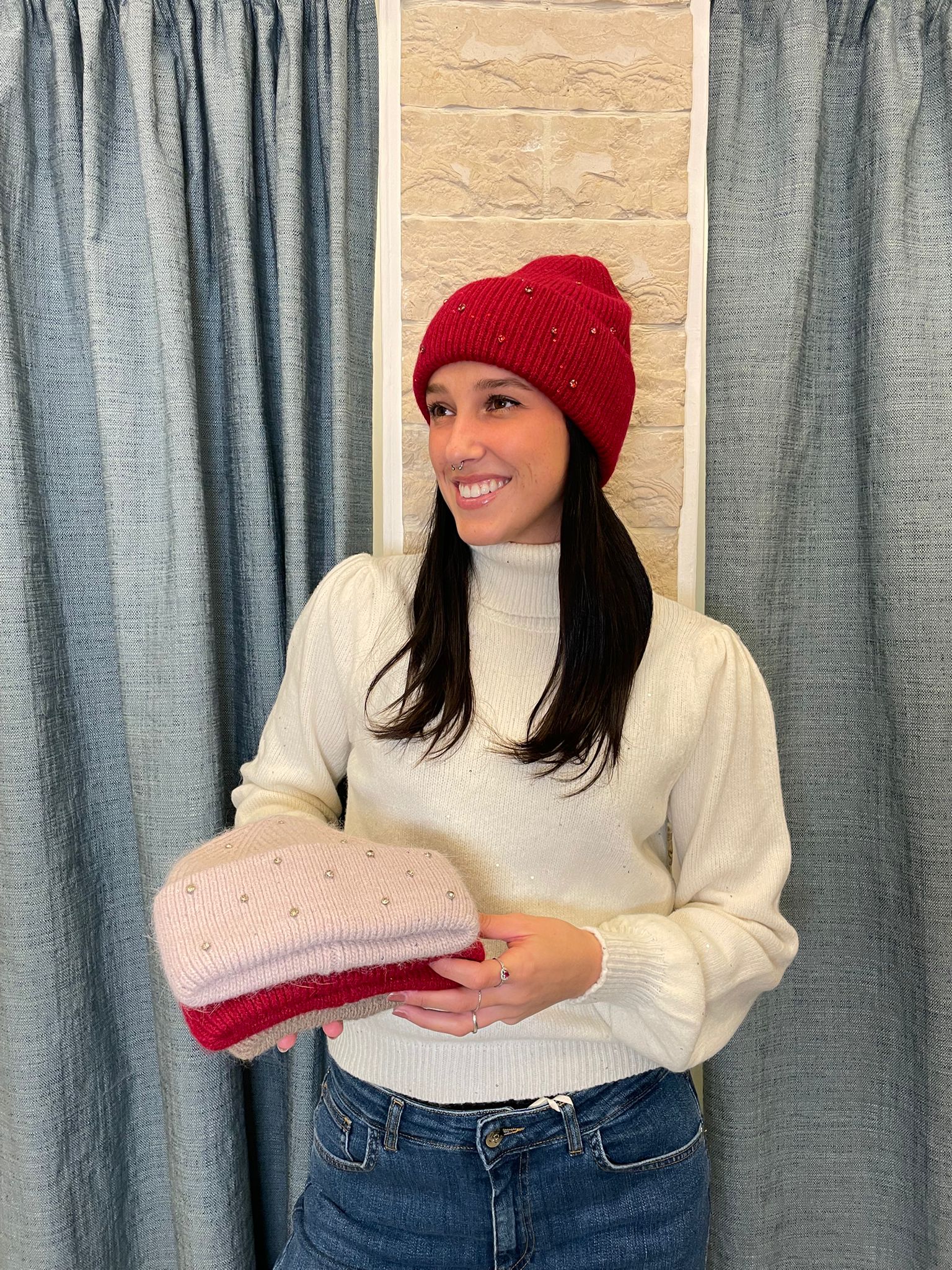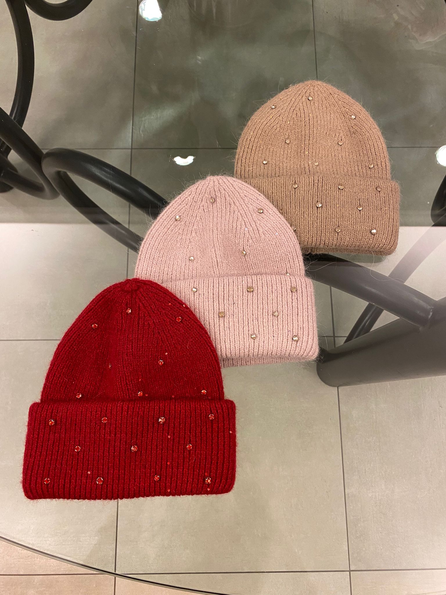 Cappellino modello cuffia con strass tono su tono sul davanti