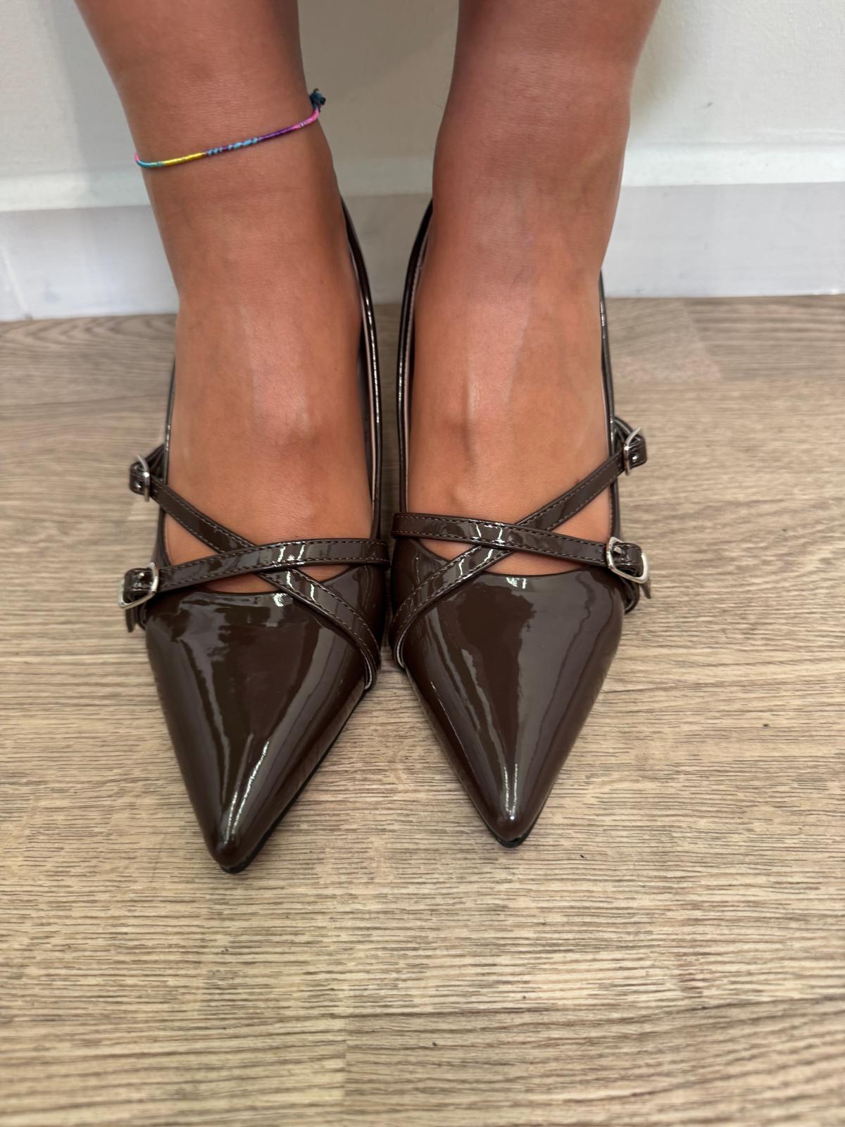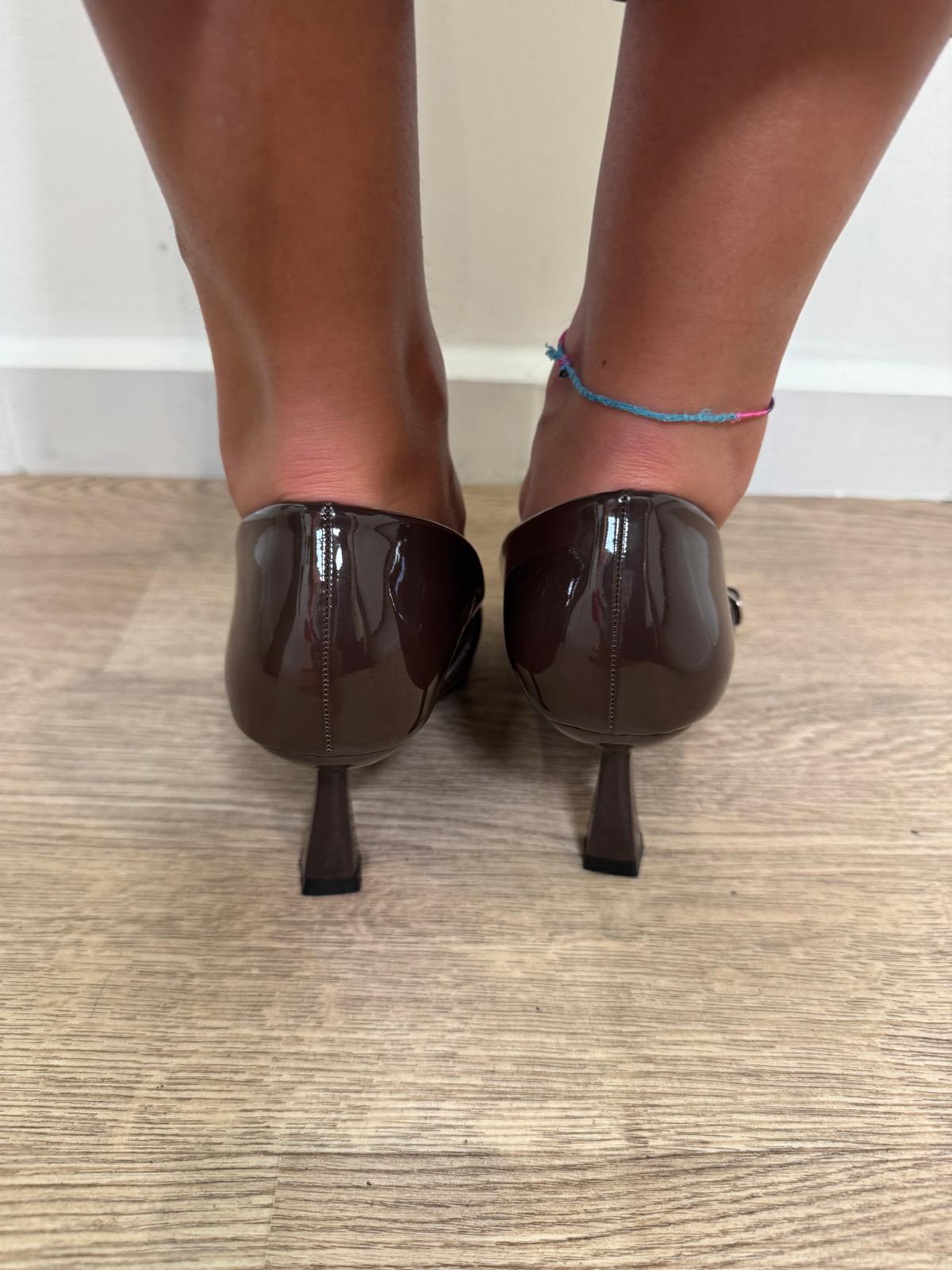 Decollèté dal taglio a punta con doppia fibbietta in color moro vernice. Tacco 6,5 cm.