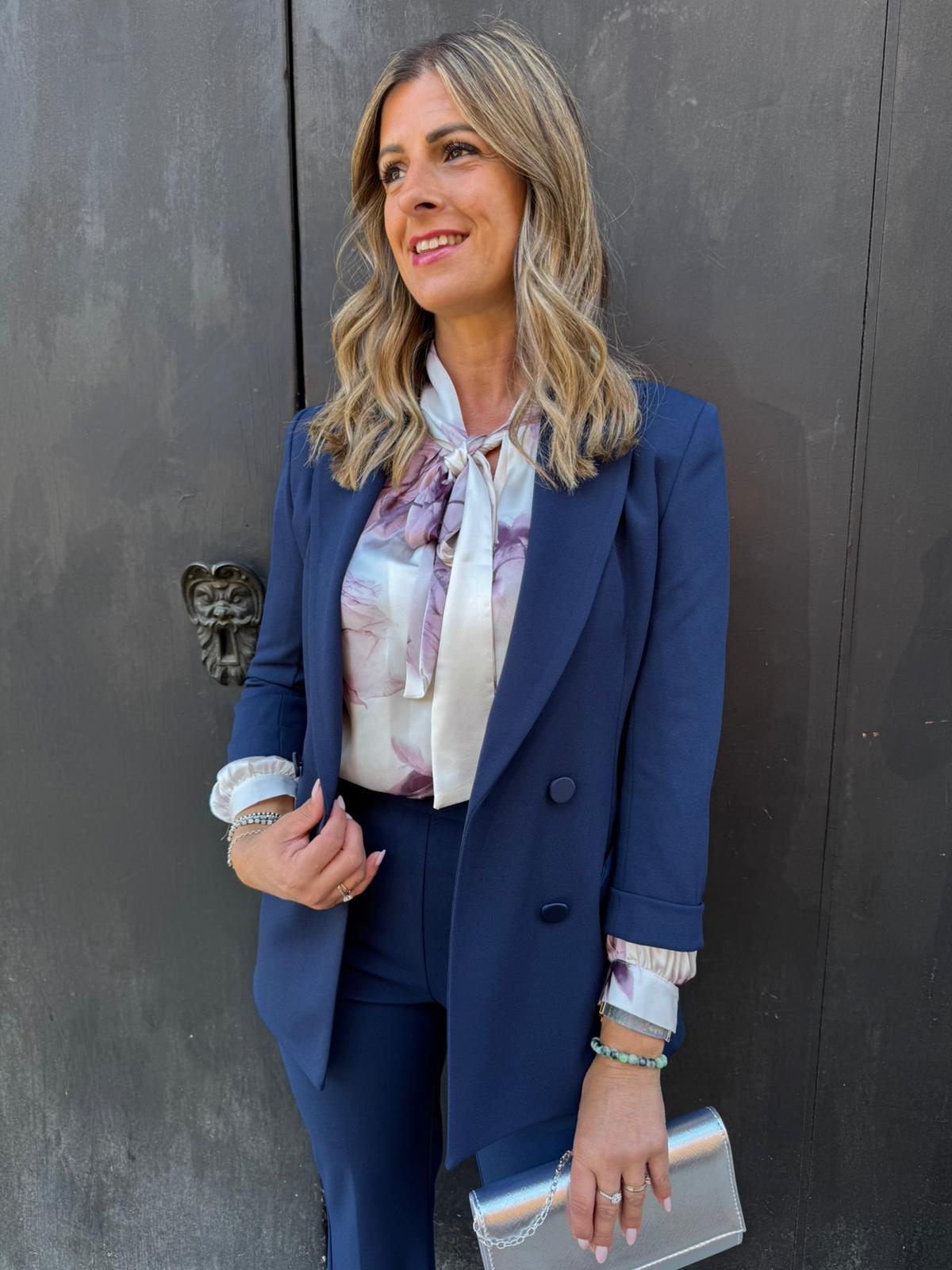 Giacca blazer con rever in raso su collo e bottoni leggermente sfiancata nel colore blu notte. Imperial
