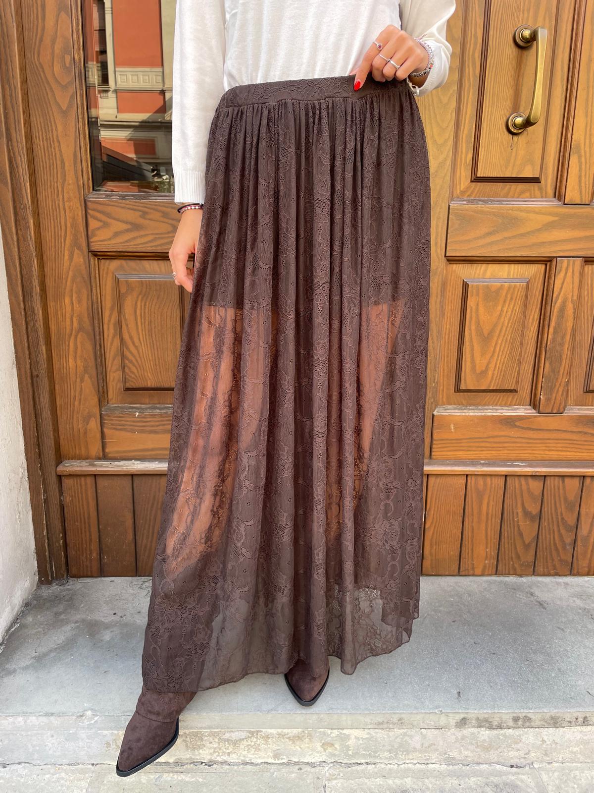 Questa gonna lunga in pizzo color cioccolato unisce eleganza e raffinatezza, perfetta per occasioni formali o serate speciali. Il pizzo delicato valorizza la silhouette con trasparenze sofisticate, mentre la tonalità calda esalta ogni incarnato.