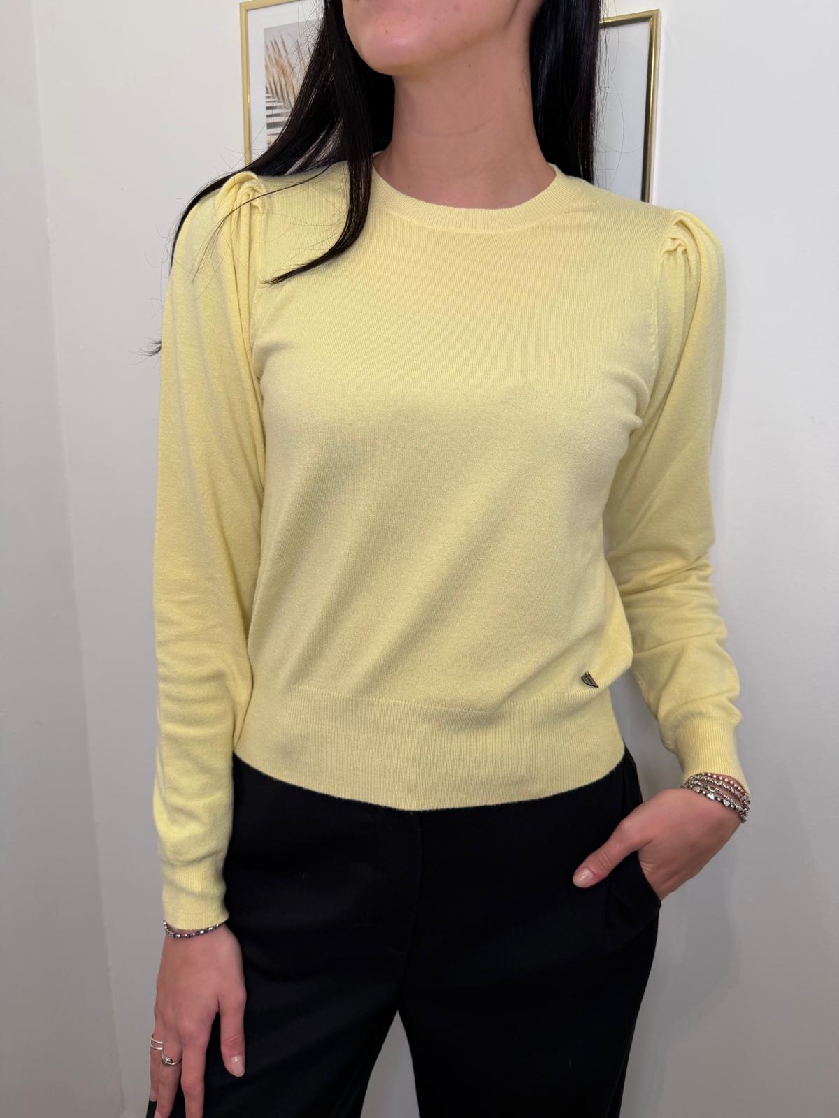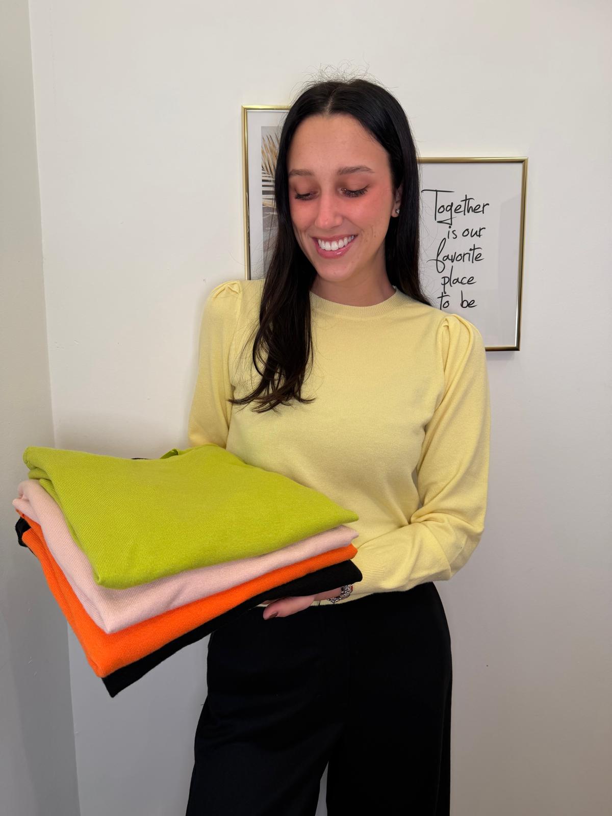 Maglioncino in maglia fine con girocollo classico e maniche sbuffo che catturano l'essenza dello stile contemporaneo. Il taglio sartoriale esalta la silhouette, mentre la texture morbida garantisce comfort durante tutto il giorno. Perfetto per creare look sofisticati sia in ufficio che nel tempo libero, questo capo versatile si abbina facilmente con jeans, gonne o pantaloni eleganti. Un must-have per chi ricerca qualità e raffinatezza nel proprio guardaroba.