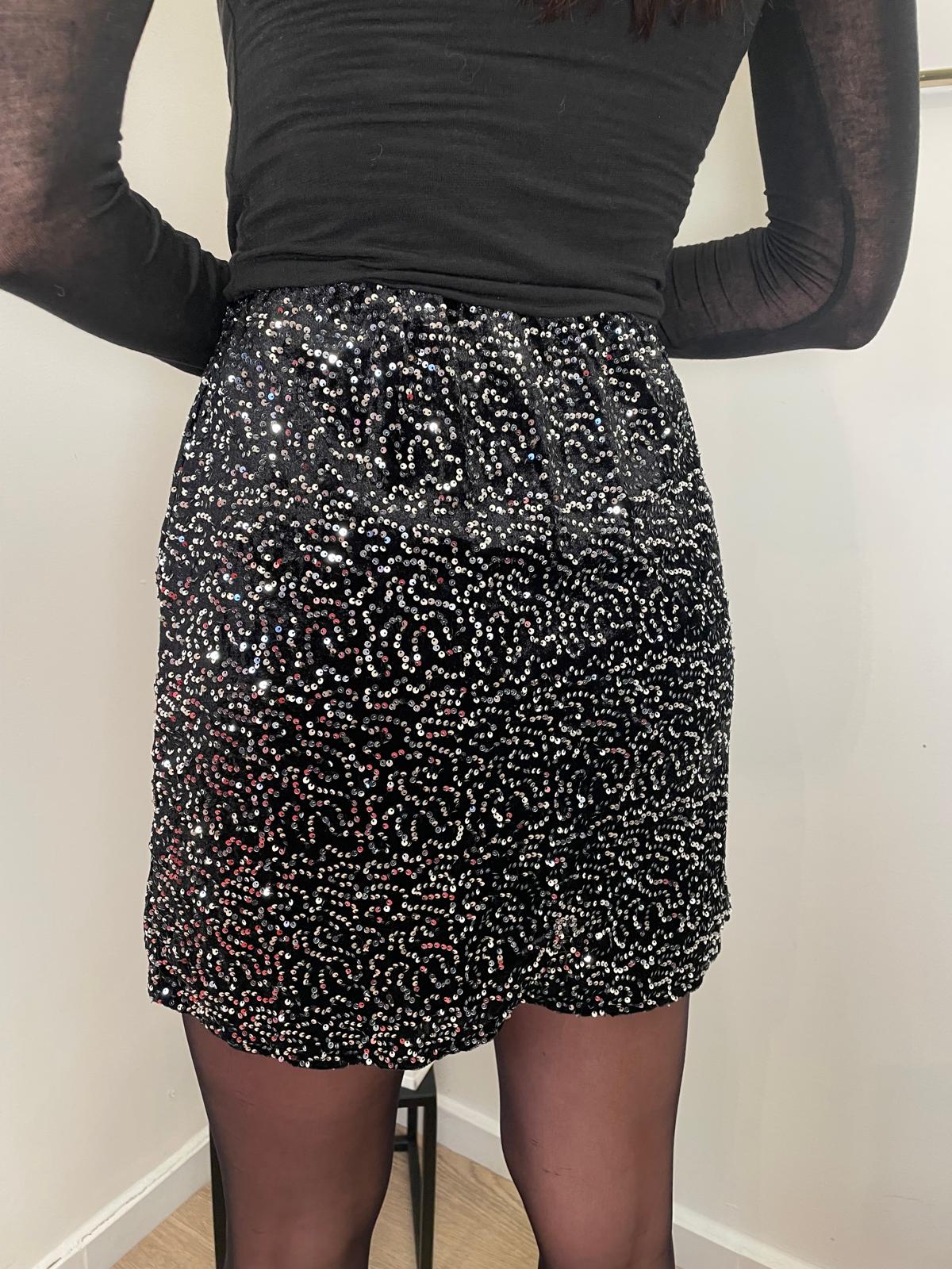 Minigonna in velluto nero con dettagli in pailettes argento che catturano la luce con eleganza. Il tessuto vellutato garantisce morbidezza e comfort, mentre le pailettes creano un effetto scintillante perfetto per occasioni speciali e serate glamour. Un capo versatile che si abbina facilmente a top neutri o body per un look sofisticato e raffinato.