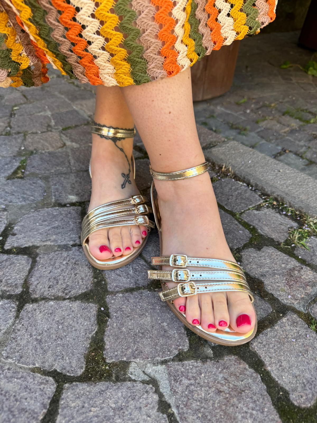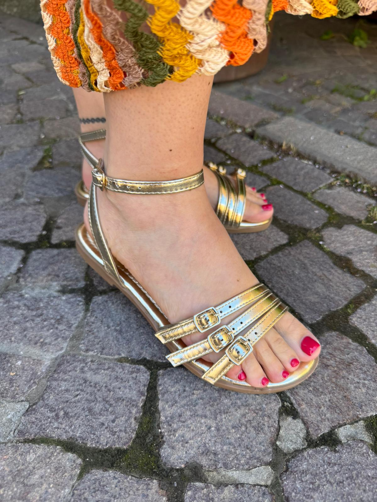 Sandalo in oro laminato, materiale ecopelle con laccetto alla caviglia regolabile.