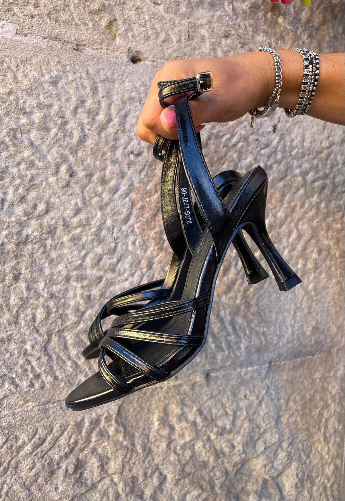 Sandalo con tacco 6cm ed intreccio sul davanti, allaccio alla caviglia.