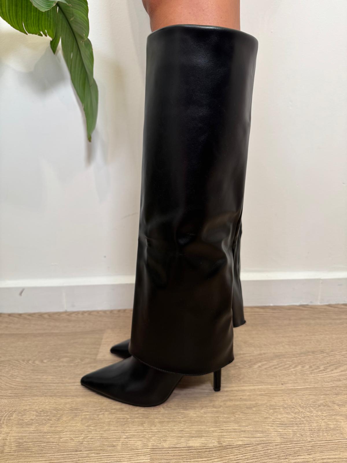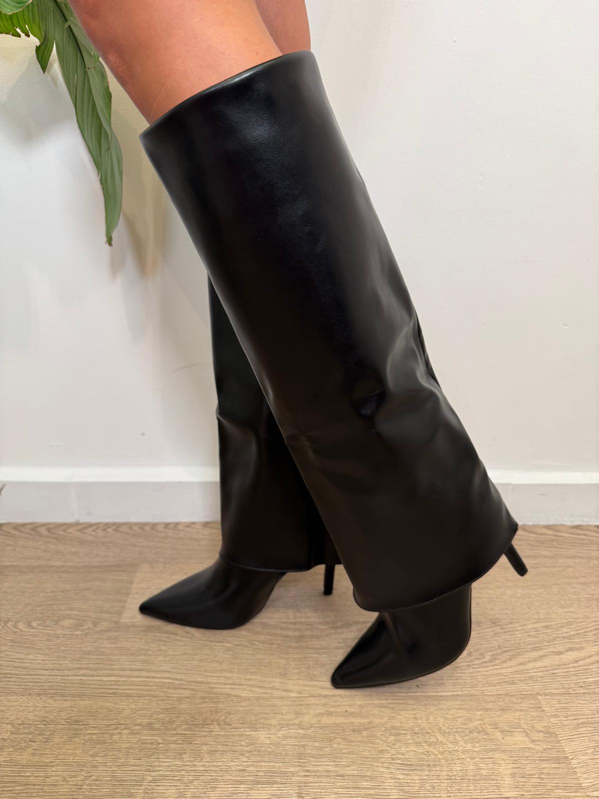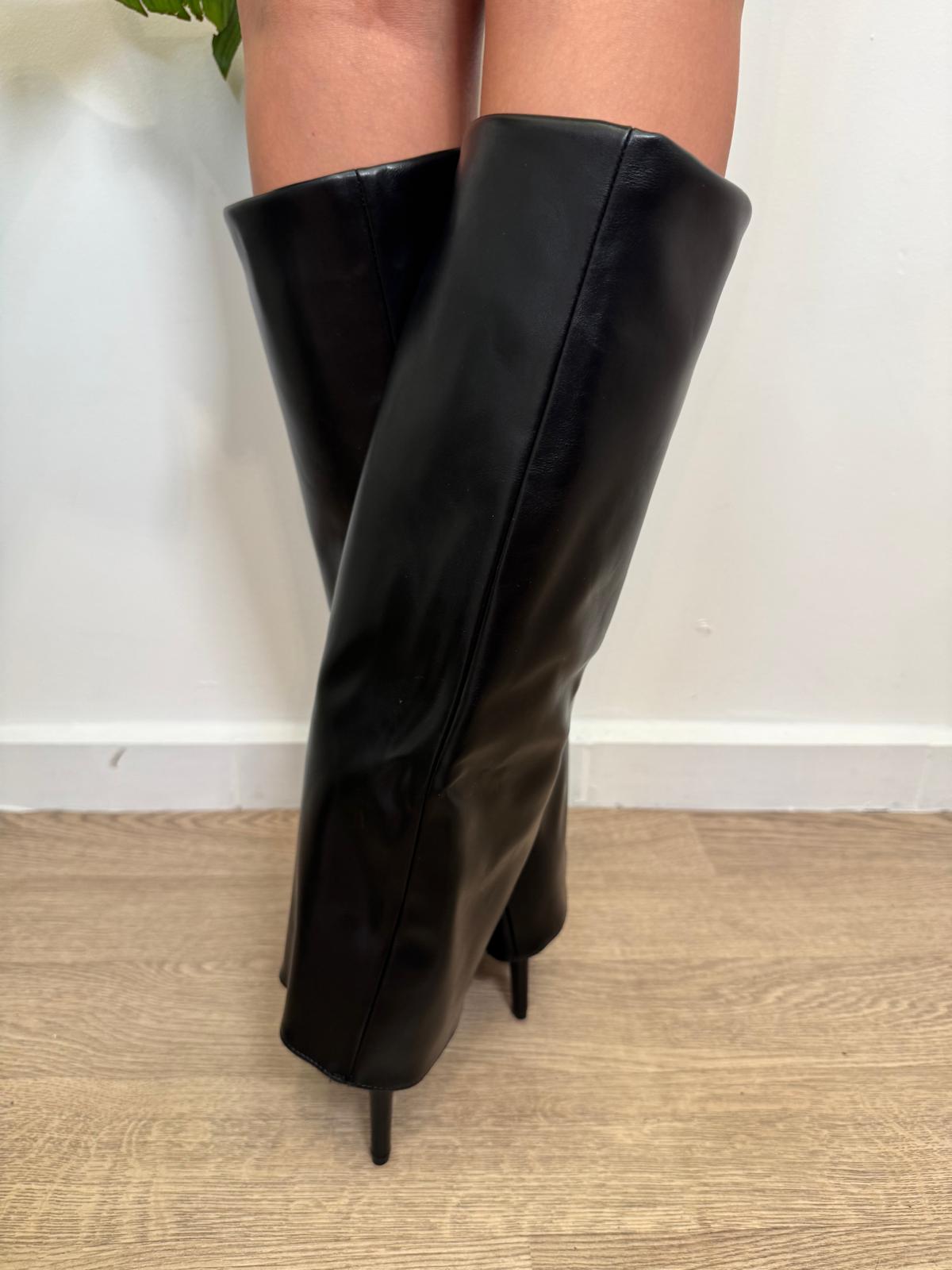 Stivale dal gambale ampio altezza ginocchio, tacco stretto in eco-pelle nero. Tacco 10 cm.