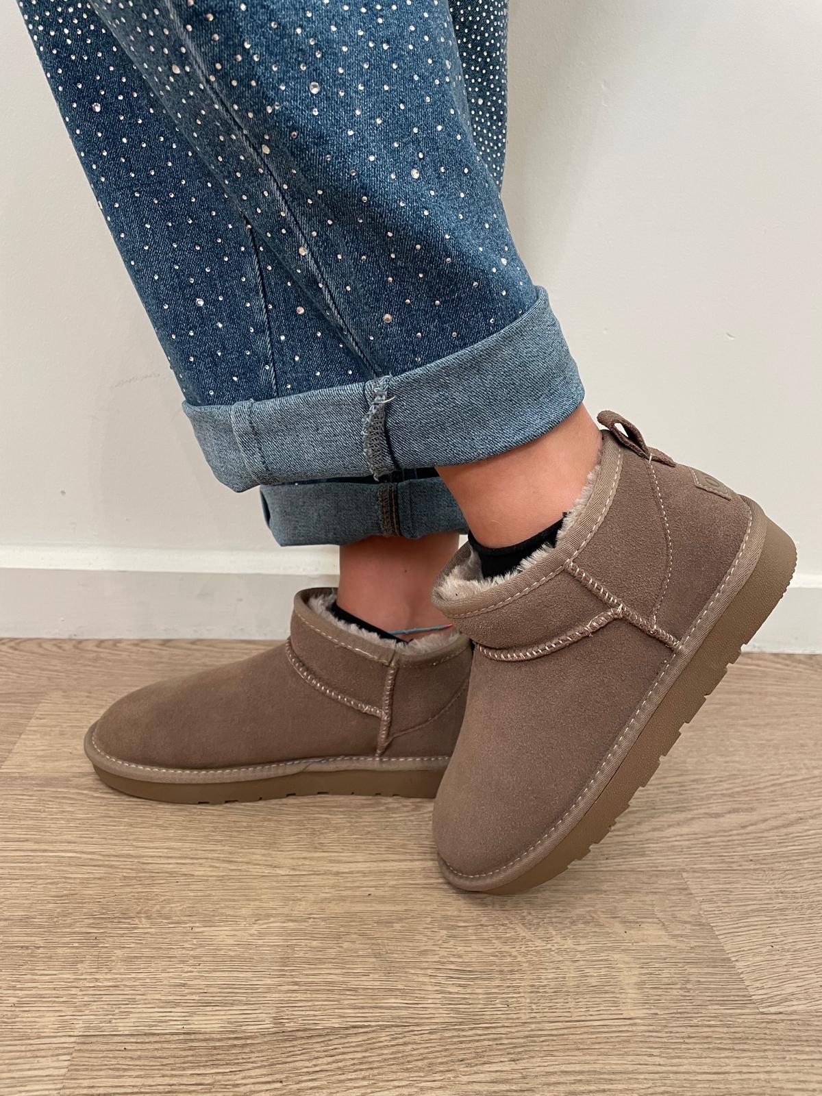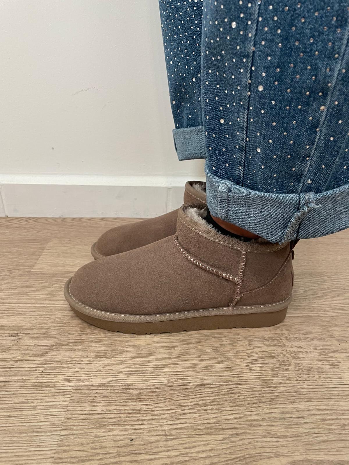 Stivaletto mini scamosciato ispired ugg. Nella colorazione Taupe con eco pelliccia interna tono su tono. Ovyè