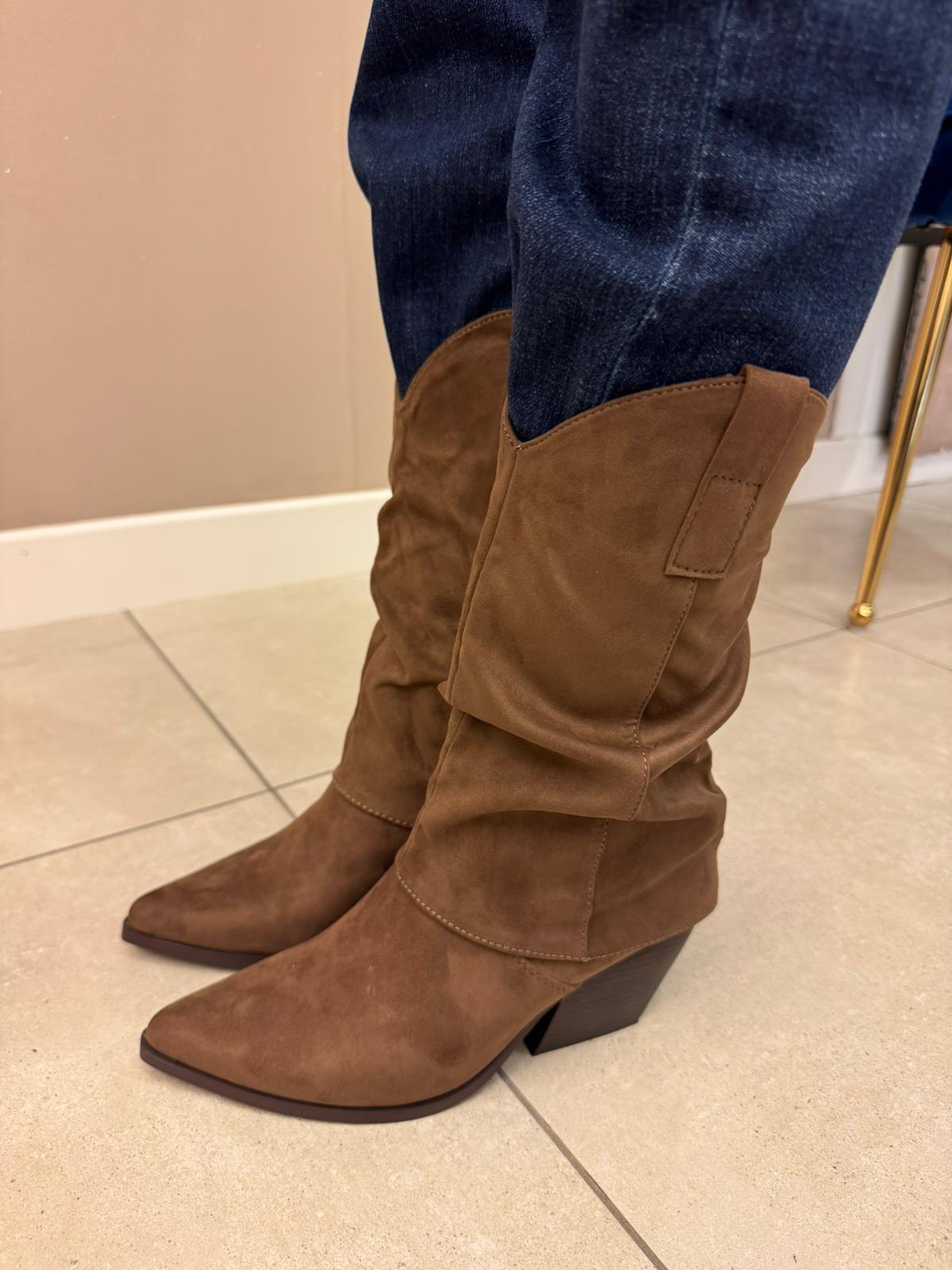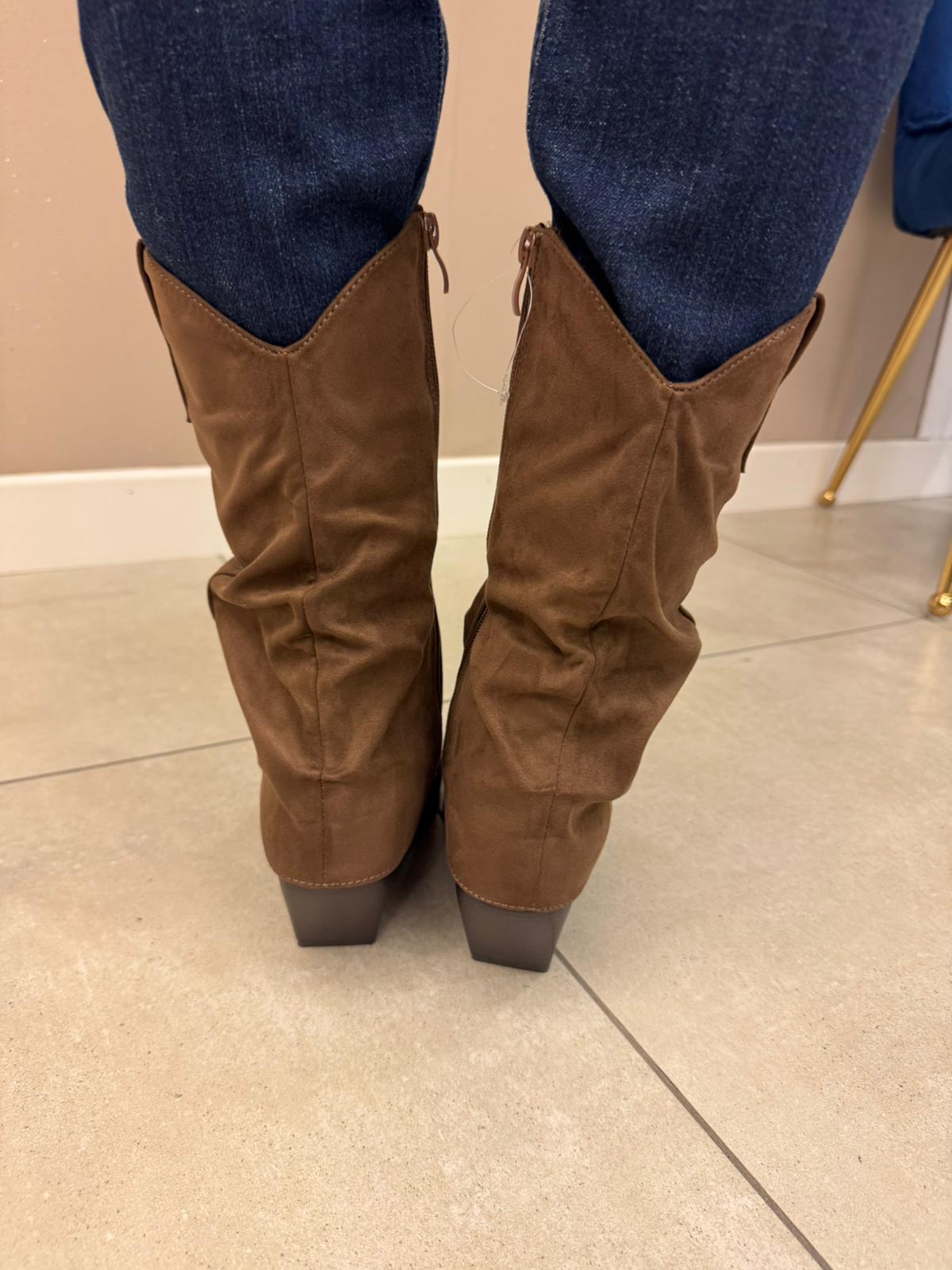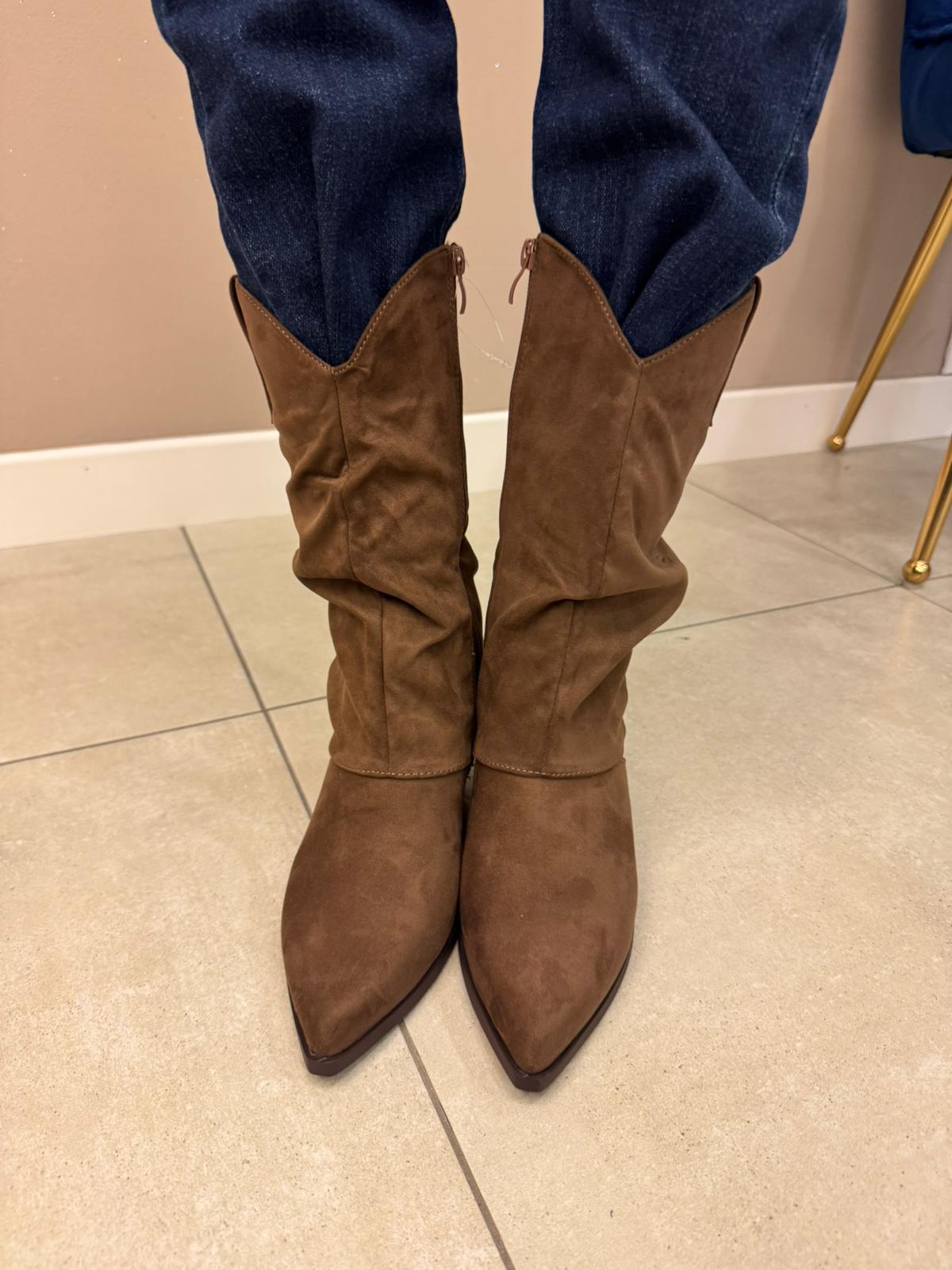 Il texano arricciato in camoscio color taupè unisce eleganza e comfort grazie alla morbidezza del materiale e alla vestibilità studiata. Il design arricciato aggiunge un tocco distintivo, esaltando la silhouette in modo raffinato. Ideale per un look sofisticato ma di carattere, questo capo si presta perfettamente a diverse occasioni, conferendo versatilità e stile a ogni outfit.